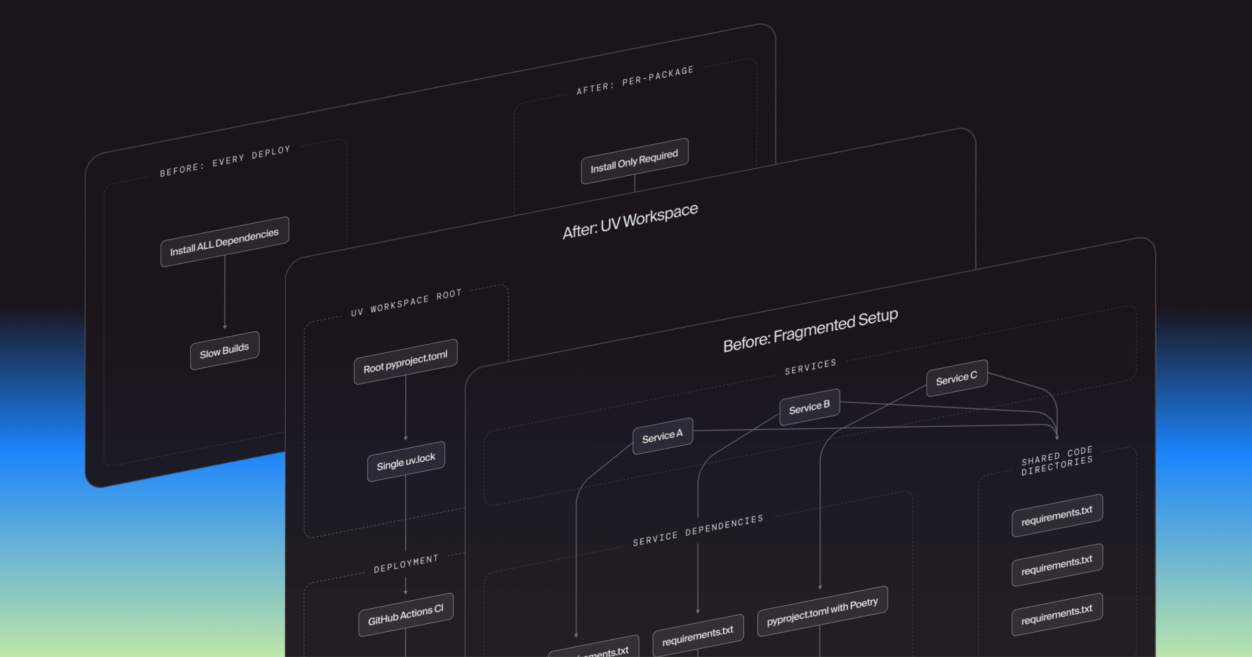 The result: A unified uv workspace with a single lockfile, standardized patterns for both services and libraries, and CI/CD that builds and deploys from GitHub Actions rather than developer laptops.
